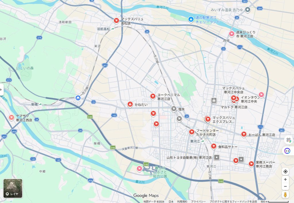 <画像出典>Google map:寒河江市内 スーパー